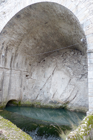 und gibt 3 km talabwärts, zwischen Vissec und Navacelles, mit ihrer Foux (Quellaustritt) eine spektakuläre Vorstellung: 1.200 Liter Wasser pro Sekunde stürzen mit Getöse aus einer Höhle hervor. Zugleich sind es aber 3 km weiter oben, an der Perte, nur 50 l/s, die versickern. Das Wasser an der Foux ist also, wenn überhaupt, zum geringsten Teil das Wasser, das weiter oben verschwindet.